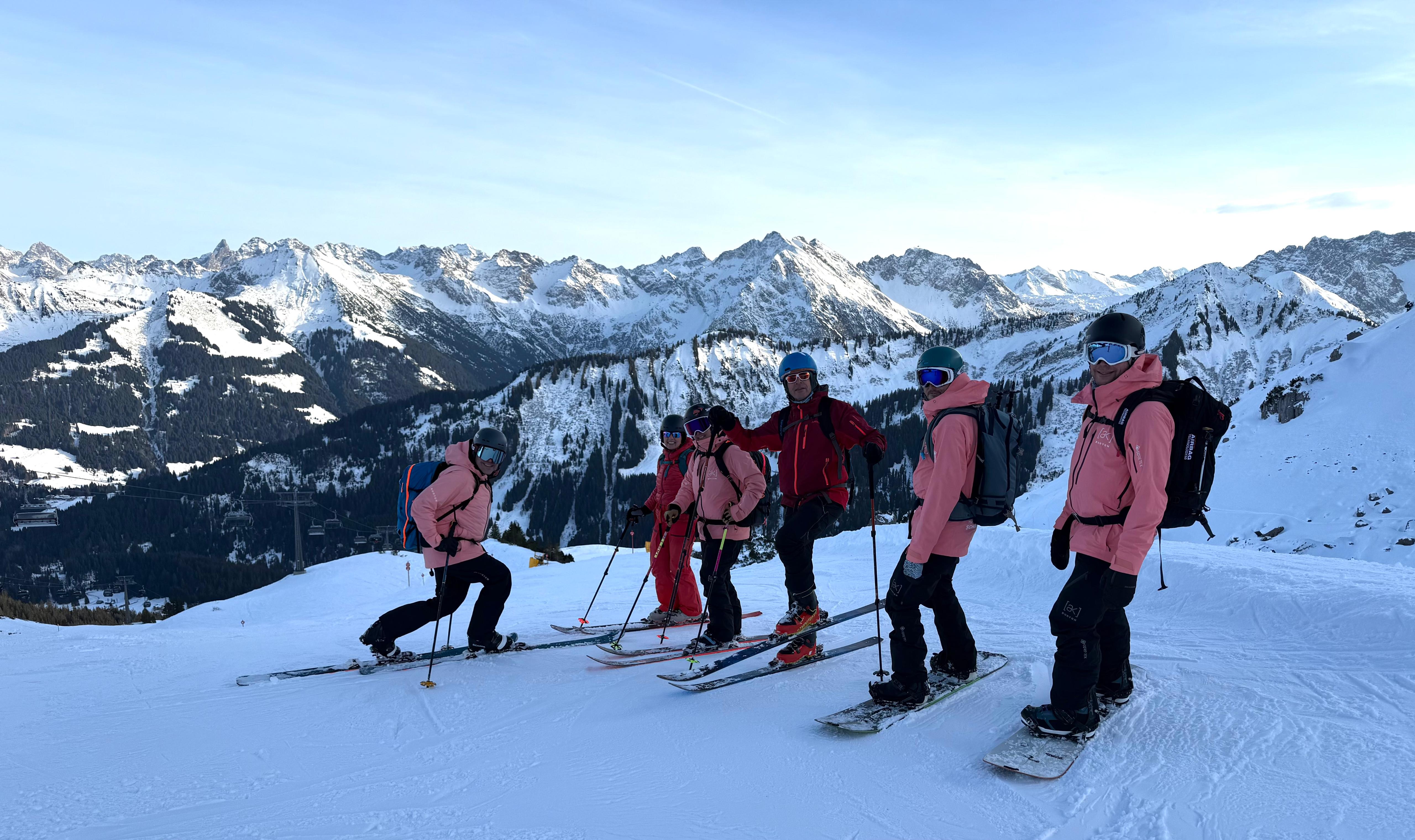 Zuerst ging es gemächlicher hinauf, doch wegen Präparationsarbeiten ab der Mittelstation, musste man später an der sehr steilen Abfahrtspiste aufsteigen, was erheblich kraftanstrengender war. Tolle Ausblicke rund in die Allgäuer Bergwelt entschädigen die Mühen des Aufstiegs. Auch die Spitzkehre im Gelände wurde geübt und erklärt. Am Nachmittag erreichte man das Ziel unterhalb der Gipfelstation und fuhr dann gemütlich über die präparierten Piste ins Tal ab.